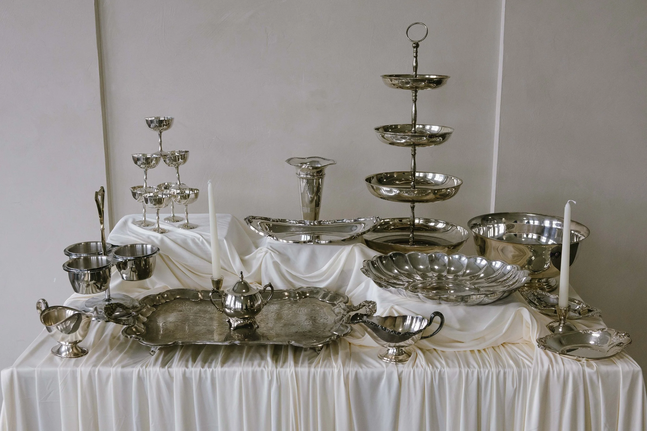 A collection of silver pieces perfect for your grazing table, dessert table, or buffet bar. Featuring a mix of trays, bowls, and serving accents, each piece adds a touch of timeless elegance and shine to your setup.