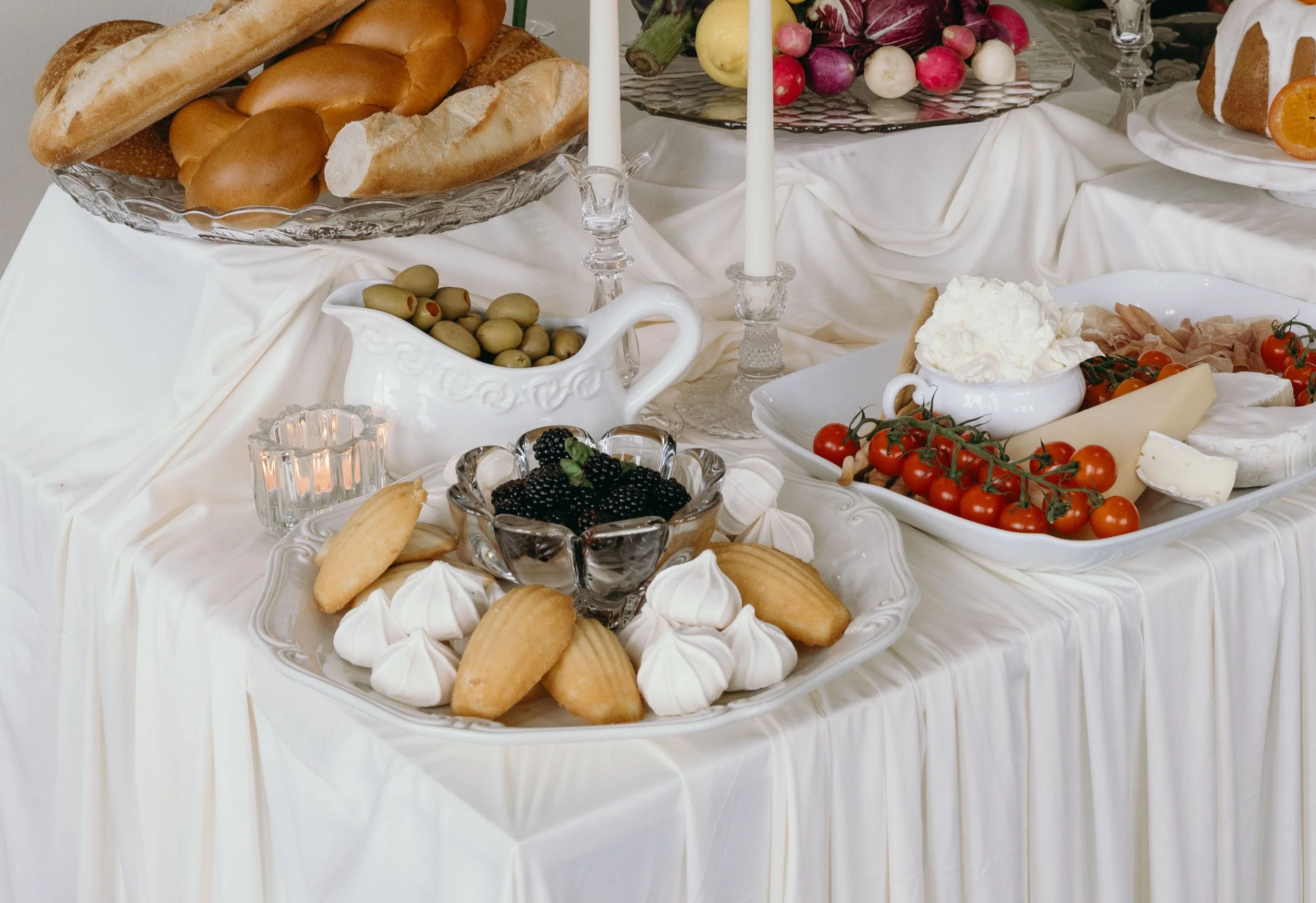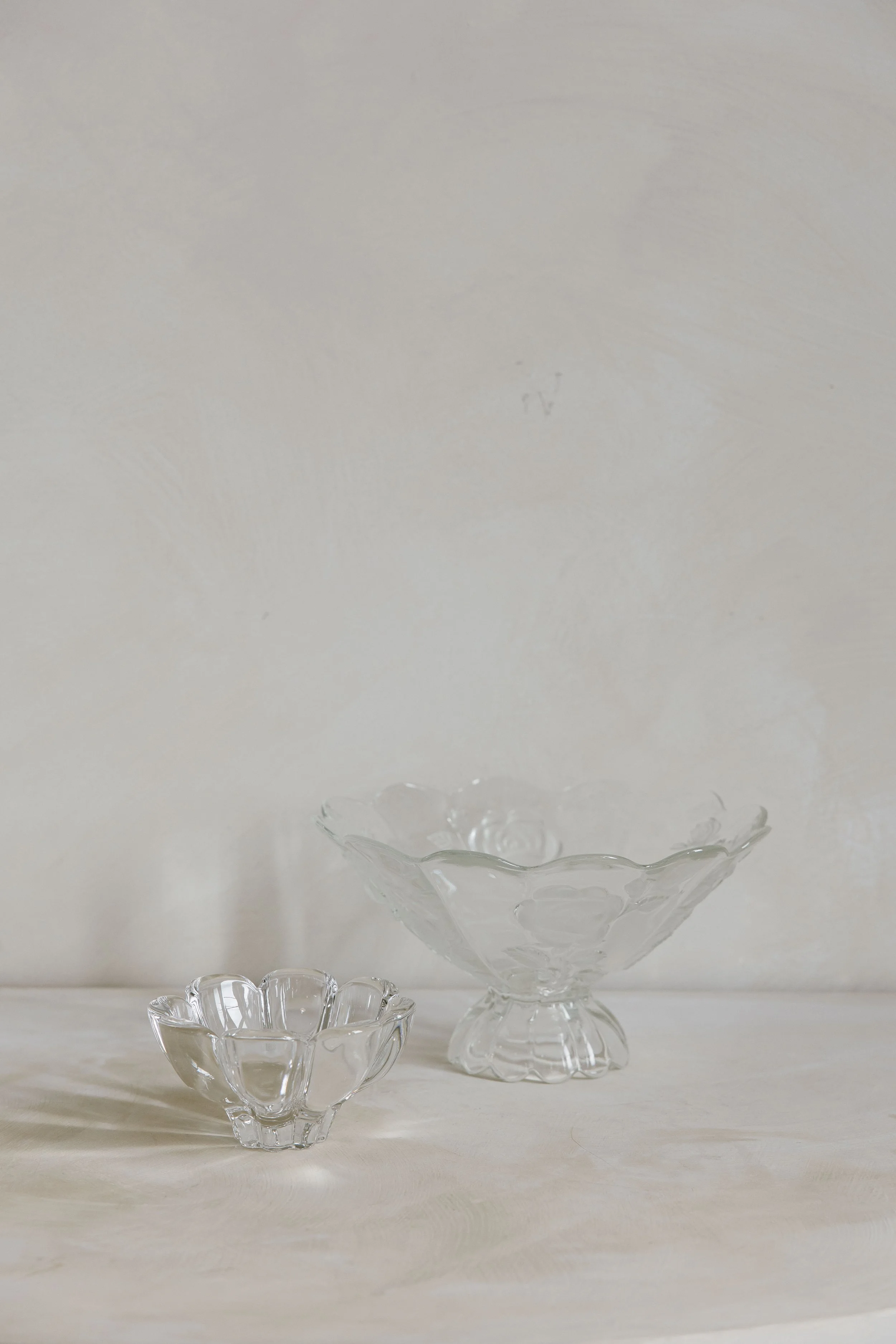 One large pedestal bowl with etched roses and a smaller glass bowl. Perfect for a grazing or dessert table.